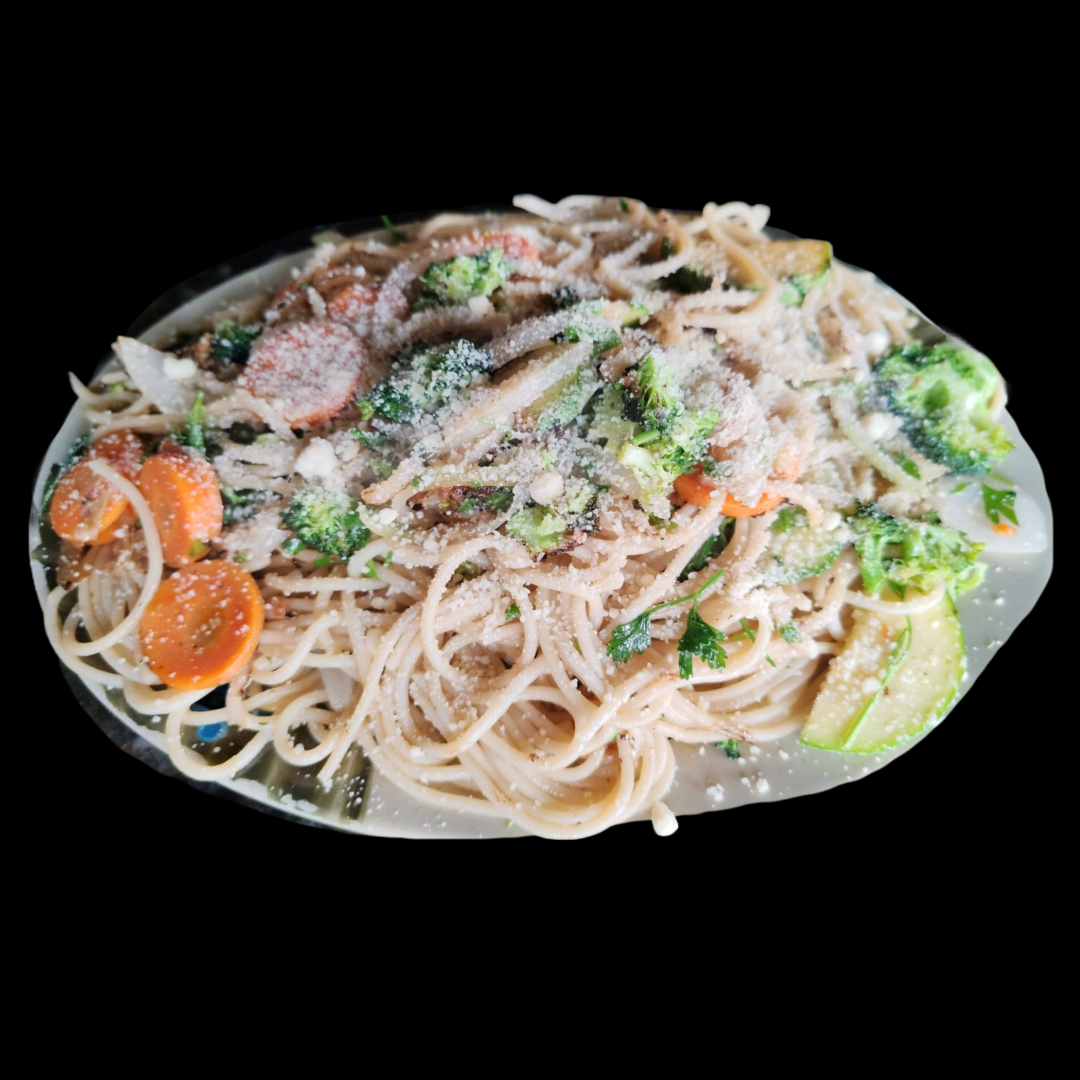 Pasta salteada con ajo, perejil, picante y queso parmesano