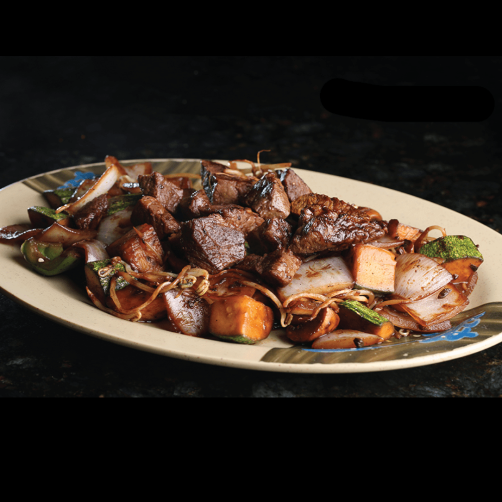 Combinación de verduras asadas a la plancha y sazonadas con salsa soya acompañado de filete de res